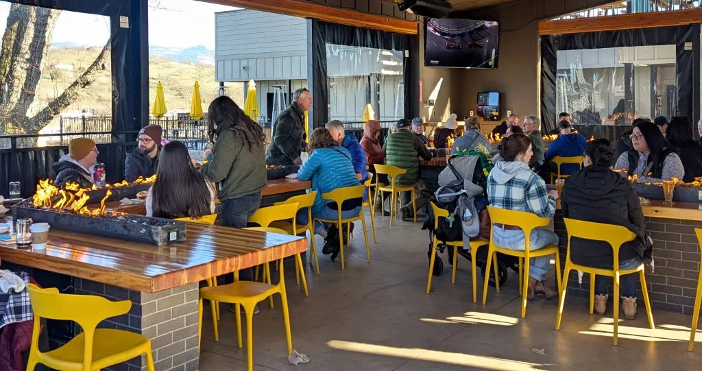 The space has communal picnic tables, Adirondack chairs, and a rooftop deck. You can play games including cornhole, ping pong, and giant chess. There is heated covered seating for when it’s cold.